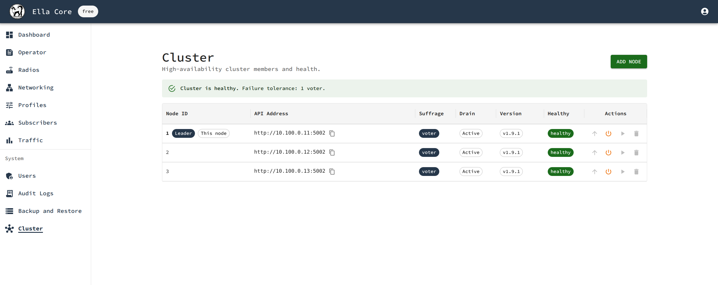 This guide walks through bringing up a three-node Ella Core cluster from scratch. For background on how clustering works, see the High Availability explanation.